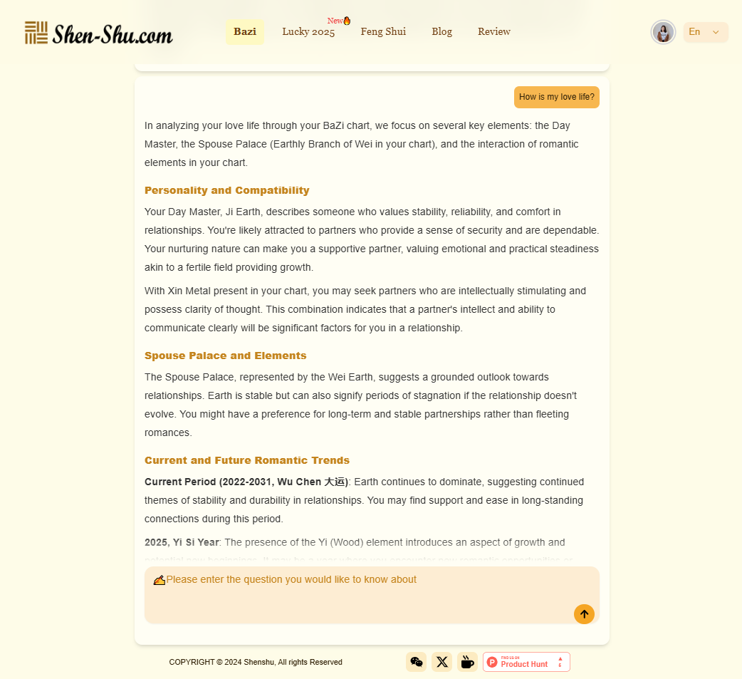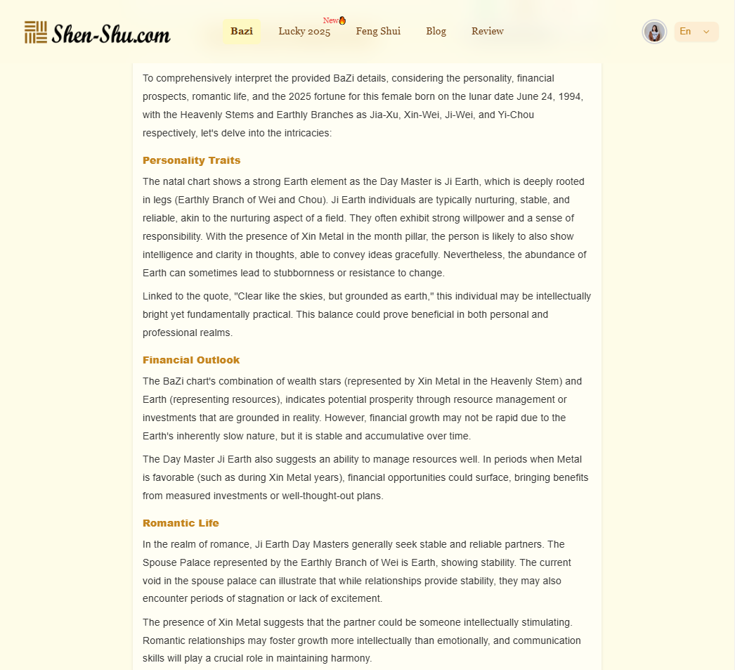 The AI behind shen-shu.com isn’t a cold, mechanical system—it’s a virtual consultant deeply familiar with Bazi principles, ready to provide practical advice tailored to your needs.